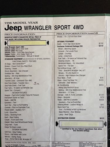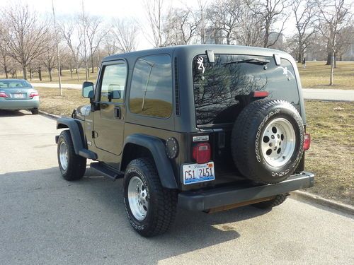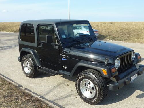 1998 Jeep Wrangler Sport (4.0L) SUV manual 5 speed. One owner private party offering. Rare stock condition and all original Mopar equipment. This Jeep has all the wants. 30" five hole alloy wheels, hard top. (yes, I have a soft top, too). Complete documentation from show room floor. Oil change approximately every 3,000 and all repair /improvement records dating back to purchase. Over $5,000 in recent preventive maintenance. (new Alternator, starter, battery, wheels, u-joints, muffler, brakes, air conditioning... All documentation available.