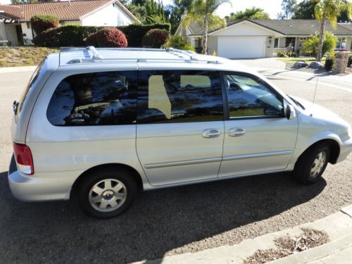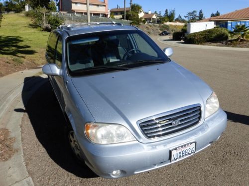Well maintained Kia mini van. Just passed smog on 12-12-13. Tires are good and front brakes recently serviced. Recent tune-up and new (Sep 2013) battery. A/C blows cold in front and back. This was grandma's mini-van so no kid stains. Interior very clean. 3 rows of bucket seats. Last 2 rows removable for nice cargo space. Roof rack provides more cargo options. California car. No rust. Can show locally. This minivan has lots of good miles left. Smoke-free minivan. Call Mark 619-990-3975 or e-mail questions. thanks