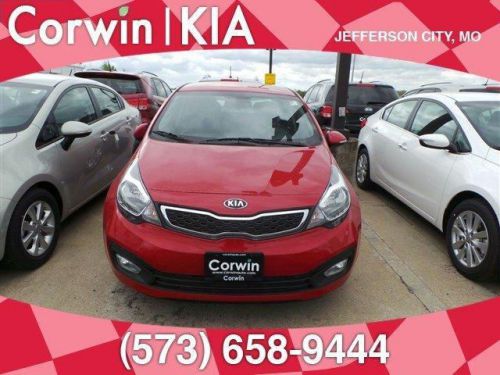 It's the start of something big. The 2014 Kia Rio is engineered to provide performance without compromise. With precise, agile handling, the Rio is remarkably fun to drive and it's available as both a sedan and 5-door hatchback. For your convenience it has available features including navigation and UVO which lets you use your compatible cell phone to make hands-free calls, receive and respond to text messages, listen to streaming audio, enjoy your personal music, and play your favorite song, artist or genre of music all by giving a single voice command. With impressive cabin space delivering first-class comfort, the Rio has an array of features designed to increase its versatility, enhance your comfort and make everyday driving more convenient. The interior is remarkably spacious and comfortable, with impressive head and legroom for all seating positions. A 6-way adjustable driver's seat further contributes to the driver's comfort. The Rio SX also includes refinements such as available heated leather seats and a tinted power sunroof. Spacious and adaptable, the Rio 5-door delivers an ideal combination of unique styling and impressive versatility. It has the same exceptional performance and all the technologically advanced features that the Rio sedan has, plus the added convenience of a hatchback. Take charge wherever you go. The Rio is designed to deliver outstanding horsepower for all-around impressive performance. It features a 1.6L GDI engine with 138 hp and an available smooth shifting 6-speed automatic transmission. Automatic transmission models have an Active Eco System. With a push of the Eco button, it adjusts the engine and transmission to optimize performance as evidenced in the EPA rated 27city/37hwy MPG. The Rio features a MacPherson-strut front-suspension system that is tuned for a remarkably smooth and comfortable ride. The SX features sleek 17-inch alloy wheels, complemented by a sport-tuned suspension and low-profile tires for precise, sporty handli Located in Jefferson City, MO we are your Mid Missouri KIA dealer with easy access from Columbia and Lake of the Ozarks. We have a terrific selection of vehicles that we sell the Corwin way: No pressure and full disclosure! Should your vehicle need service, we offer a shuttle service, free wireless internet and a child play area! Come see why we're different from the rest and get behind the wheel!