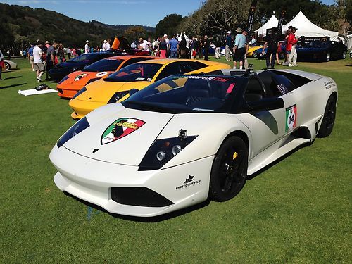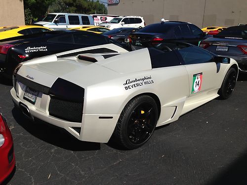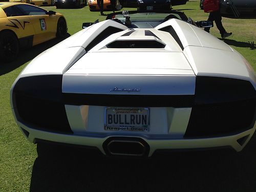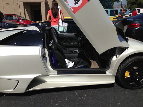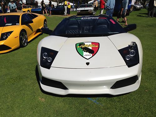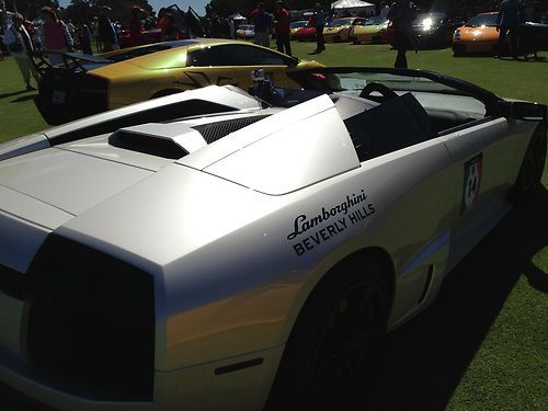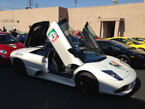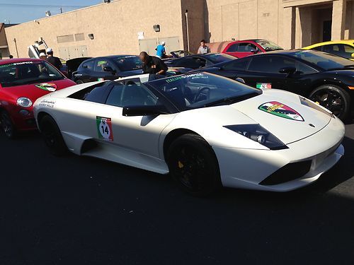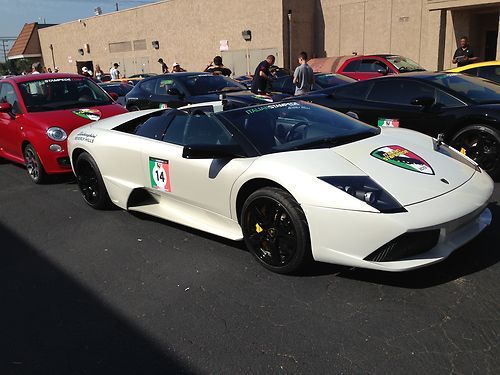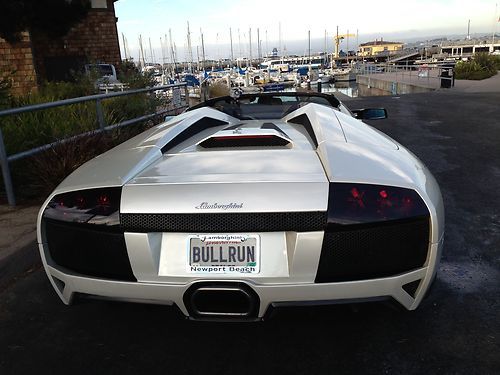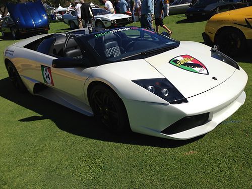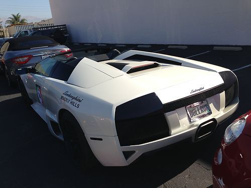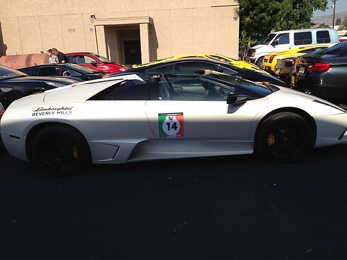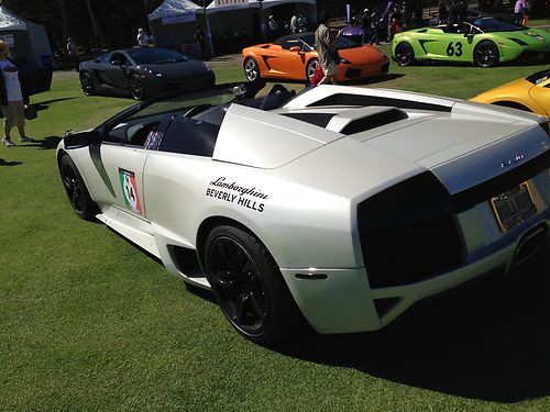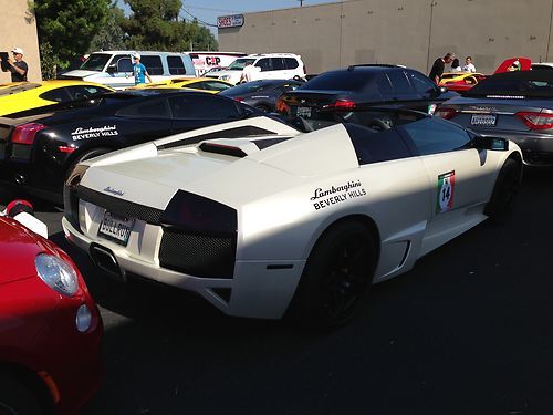 2008 Lamborghini Murcielago LP 640 Roadster E gear in Balloon White. Runs and drives great. Steals the show everywhere, one of only two LP 640 Roadsters out of the 105 Lamborghini's in the Italian Stampede of August 2013 from Los Angeles to Monterey. V12 engine, 6 speed egear transmission, carbon fiber interior with Italian leather seats. Full touch screen entertainment system. Sold as is where is, no warranty, non refundable deposit and sale. Must go. All pre purchase inspections gladly welcomed before end of auction. Car is a convertible roadster. It has no top (although one can be purchased it cannot be used as it has a warning from Lamborghini not to go over 100 mph with a top on) It does come with the wind deflector for the windshield in carbon fiber, which keeps the wind out of the interior at high speeds. Good luck bidding. No loans or trades of any sort (unless you have a Pagani). Gold coins preferred, but cash and bank wires are ok too. As of the listing of this Auction, during Pebble Beach Concours, car is in Monterey California, but is being moved to Baton Rouge Louisiana. So if you want car and you are in California please contact us immediately to avoid moving car twice.