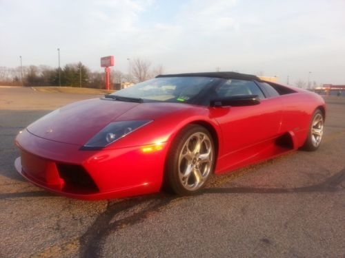 Up for sale is a 2005 Murcielago Roadster. It has 2,050 miles on it and has been extremely well taken care of, and is a one owner vehicle. The exterior is Rosso Vik, or candy apple red, with a beautiful white leather interior trimmed in black with red stitching, with red carpet equipped with brand new black floor mats with large red bulls. Yearly service was done at around April of 2013, at which the dealer said the clutch was around 97%. Larini exhaust was just installed in August giving it just the right amount of sound to let that Italian V12 sing! The paint is in Excellent shape, very clean all around.This is a rare Murcielago as only 25 roadsters were manufactured in 2005 worldwide. Tires are in fantastic condition. This Murcielago is one of the cleanest you will find, as it has been driven very sparingly. This is as close to new as you can get. Feel free to call me with any questions!!! Here is your chance to get one of the lowest mileage and cleanest Murcielago roadsters in the country!!! My number is 513-594-0923. No accidents, no paint work, just a beautiful, original car. Please contact me with any realistic offers.