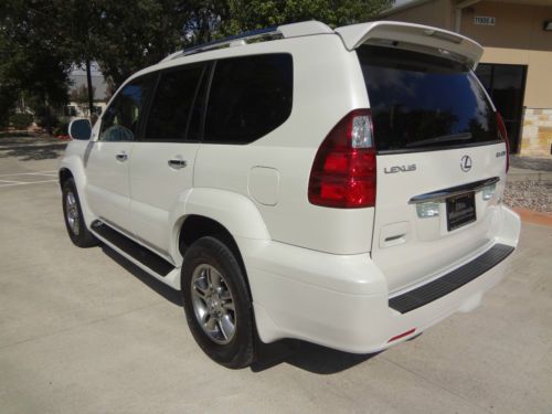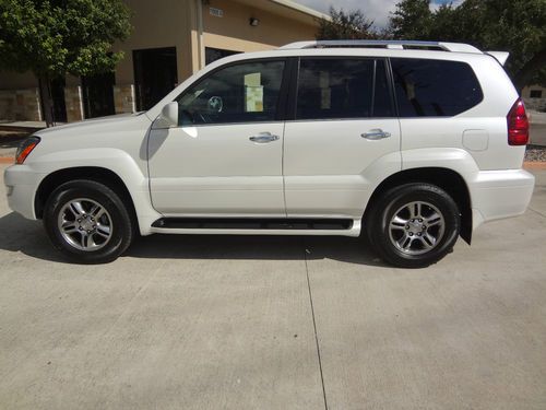 You are bidding on a 2009 Lexus GX 470 with 52,800 miles. Two owner vehicle, clean Carfax, all service performed at local Lexus Dealer Exterior: Blizzard Pearl Interior: Gray Leather Some options include: Navigation/Mark Levinson Audio Package Includes: Voice-Activated DVD Navigation System & Back-up Camera with Steering Wheel Voice Command Button, BlueTooth, EMV Mark Levinson 14-Speaker Premium Audio System, and DVD/CD Changer. Towing Prep Package Includes: Wiring Harness, Converter, Sub-Bracket, Rear Bumper Hitch Cover w/ Cutout. Preferred Accessory Package Includes: Cargo Mat, Cargo Net, and Wheel Locks. Mutli-Adjustable Power Heated Front Seats w/ Memory, Power Tilt/Telescopic Wood & Leather Steering Wheel w/ Auto Tilt-Away and Audio Controls, Power Windows, Front Green Tinted Glass w/ Rear Privacy Glass, One-Touch Open/Close Moonroof w/ Pinch Protection, Power Door Locks w/ Anti-Lock Out Feature, Chrome Roof Rails with Black Cross Bars, Intergrated Body-Color Illuminated Running Boards, Rear Spoiler. For more information please contact Elite Motorsports at 512-452-9068