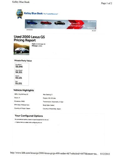 This vehicle is from a local non smoker, ONE OWNER-ADULT DRIVEN new car trade-in. It has been babied since new and the previous owner drove a long daily commute to work. It has been dealer serviced since new and everything from timing belts, to steering bushings, shocks, shift linkage, key cylinders, etc. have been replaced. If you were to come see and drive this vehicle, you would believe it had less than 50k on it. I know these vehicles very well as I sell Lexus vehicles to Lexus dealerships, and also having a GS400 several years ago, This vehicle has Nakamichi Premium Audio (very rare and sounds excellent), and heated seats. It also has Michelin tires that are 80%. It drives like new. The paint is very good with minimal surface scratches. The leather seats are also very good with no tears and minimal wear. All windows, moon roof, etc. are working flawlessly. The A/C is ice cold and thee are no lights out on the displays or pixel issues. This vehicle is a pure joy to drive, it drives like it did when it was first new. Don't let the mileage scare you. I would have NO problem driving this vehicle across the county with my family in it. It must be seen and driven to be appreciated. It is 100% stock. You will not be disappointed.
