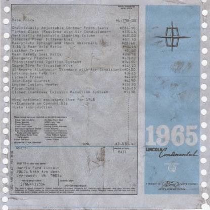 Triple A Collector Car Agreed Value of $74,000.00 1965 Lincoln Continental Maintenance Manual (NOT A REPRODUCTION) 1965 Lincoln Continental Window Sticker She has ALL NEW fluids and filters, her tires have 10% wear or 90% left on them, she is ready to go!!! At this point I believe I have covered all of the bases…. If you should have any questions please call 949-433-0404 Griffin ONE LAST THING… "IF YOU DO NOT HAVE CONTROL OF THE FINANCES AND YOUR WIFE TELLS YOU WHAT YOU CAN AND CAN NOT