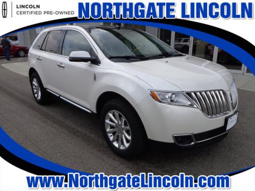 LINCOLN CERTIFIED, AWD, 1.9% APR UP TO 66 MO. W.A.C. Elite Package (Panoramic Vista Roof, SIRIUS Travel Link, and Voice Activated Navigation), Adaptive HID Headlamps, Ambient Interior Lighting, BLIS Blind Spot Information System, Heated 2nd Row Outboard Seating Surfaces, Heated front seats, Heated Steering Wheel, One Owner Clean Carfax, Premium Package, Radio: Premium AM/FM Stereo/CD/MP3, Rain Sensing Wipers, Rear-View Camera, SIRIUS Satellite Radio, and Ventilated front seats. This 2012 Lincoln MKX is for Lincoln enthusiasts who are hunting for that babied, one-owner gem. Lincoln Certified means you get meticulous 200-Point inspection by factory trained technicians, the confidence of a 6-year/100,000-mile comprehensive warranty coverage and complimentary 24/7 Roadside Assistance. Additional features include the assurance of a vehicle history report. Luxurious by standards, Certified by Ours. It is nicely equipped with features such as Elite Package (Panoramic Vista Roof, SIRIUS Travel Link, and Voice Activated Navigation), AWD, Adaptive HID Headlamps, Ambient Interior Lighting, BLIS Blind Spot Information System, Heated 2nd Row Outboard Seating Surfaces, Heated front seats, Heated Steering Wheel, One Owner Clean Carfax, Premium Package, Radio: Premium AM/FM Stereo/CD/MP3, Rain Sensing Wipers, Rear-View Camera, SIRIUS Satellite Radio, Ventilated front seats, 10 Speakers, 3.39 Axle Ratio, 4-Wheel Disc Brakes, ABS brakes, Air Conditioning, Alloy wheels, Auto-dimming door mirrors, Auto-dimming Rear-View mirror, Automatic temperature control, Brake assist, Bumpers: body-color, CD player, Delay-off headlights, Driver door bin, Driver vanity mirror, Dual front impact airbags, Dual front side impact airbags, Electronic Stability Control, Four wheel independent suspension, Front anti-roll bar, Front Bucket Seats, Front dual zone A/C, Front fog lights, Front reading lights, Fully automatic headlights, Garage door transmitter: HomeLink, Heated door mirrors, Illuminated entry