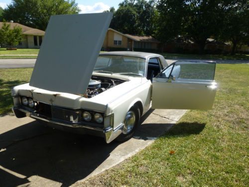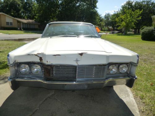 Running, driving, tagged and inspected 1968 Lincoln Continental Coupe with around 89k miles on it. White exterior, black vinyl top, black interior. Vinyl top is peeling. Paint is faded but body is straight other than some damage up front. I have a front grille that goes with the car. No frame or structural issues. Car drives straight and true. Surface rust in a few spots. Engine is the 365hp 460 with C6 auto transmission. Runs and drives good.