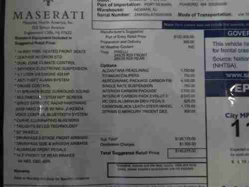 Out of the two trim levels of the Maserati Granturismo, this is the most rare and sought after S model, sportingh the 4.7 L V8 engine 433HP. This is a one owner car, low mileage (13,663) and extremely loaded. Upgrades include; Alcantara headlining ($1,750.00), titanium calipers ($750.00), aerodinamic package carbon fiber ($4,300.00), single rate suspension ($750.00), interior carbon package ($2,550.00), interior carbon pack. evolut. II ($2,075.00), mc des. aluminum driv. pedals ($625.00), carbon/black leather steering wheel ($1,175.00), 20" rims g. mercury trident des. ($800.00). A copy of the window sticker can be found below. The original MSRP was $140,675.00, don't miss your opportunity to save yourself a lot of money with this one!!! The car has never been involved in any accidents and has never had any paint/body work done. Call Frank or James for a Carfax at 1-(888)-430-0051 with any additional questions or requests./