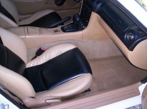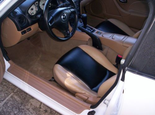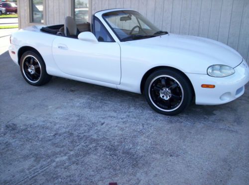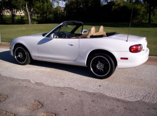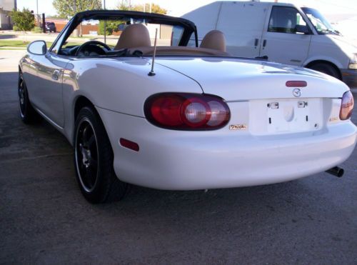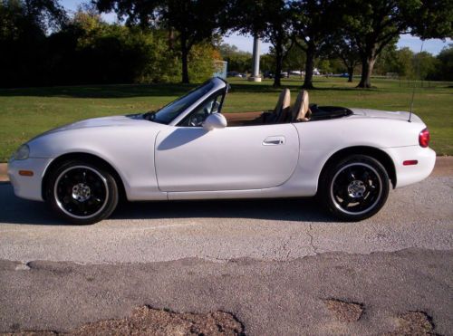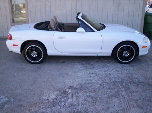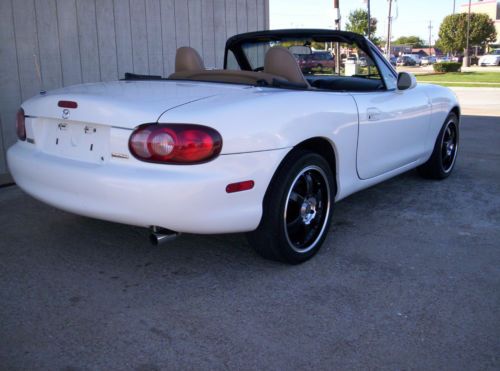 YOU ARE BIDDING ON A BEAUTIFUL ONE OWNER PURE WHITE 2001 MAZDA MIATA MX-5 NARDI TORINO WITH 109K MILES. IT IS EQUIPPED WITH THE VERY PEPPY AND ECONOMICAL 16 VALVE DOHC 1.8L 4 CYLINDER ENGINE. AUTOMATIC TRANSMISSION WITH OVERDRIVE. TWO TONE TAN AND BLACK LEATHER INTERIOR. POWER WINDOWS, LOCKS AND MIRRORS. CRUISE CONTROL, AIR CONDITIONING, NEW KUMHO ECSTA AST TIRES ON BLACK ENKEI 6 SPOKE RACING WHEELS, FACTORY BOSE STEREO.(THE STEREO DOES HAVE A CD PLAYER SLOT BUT IT WILL NOT PL AY, TUNER PLAYS EXCELLENT). BRAND NEW TEXAS STATE INSPECTION STICKER GOOD UNTIL NOVEMBER 2014.