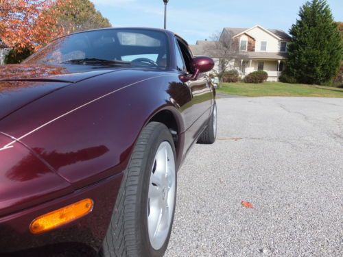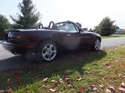 1995 Miata only 78,000 miles rare M edition excellent condition always garage kept beautiful Merlot color paint. Never in an accident like new. Adult owned. Extras include role bar painted to match American racing wheels Borla exhaust ect ect!!! NEW TOP GLASS WINDOW. This car is being offered locally and auction can be stopped at anytime. If there any questions give me a call but please only serious inquiry. (302) 893-5422 no scammers PLEASE.