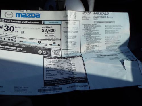 Mazda Mazda2 2013 Sport five door hatchback $12900.Original price $16355. NOT A RENTAL. one driver still in 3 warranties, 100% as new condition. 4 cylinder, automatic, air conditioning, power windows/ locks/ mirrors, tilt and telescopic steering wheel, AM/FM/CD, remote keyless entry, front/ side/ head airbags, alarm system, California emissions, lots more. Clean Carfax, clean title, clean history. Rare opportunity to purchase a really good car in nearly new condition at such a value price. Excellent cars fully serviced by our experts to the most paranoid's satisfaction. Experience? We've been in used imports since 1966. We sell 2 1/2 times the national average for repeat and referral-we must do something right. Members of Better Business Bureau. Mechanic's inspection welcome. Free Carfax upon request. E-mail or (better) call toll-free 888-676-6352 or (best) come visit.Thanks