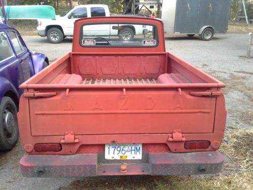 1972 Mazda B1800 pickup. Runs great. Some issues (see defects). Tires, rotor, cap, plugs and leads have less than 5000 miles on them. Did a compression check when I got it, average of 105 psi (low one was 95psi and highest was 120psi). New master cylinder converted to dual piston. Rebuilt master and slave for the clutch. Battery not included. Deal includes original tires and wheels with hub caps (there are only three...missing one). Deal also includes an engine and transmission (five speed) from a 1977 ford courier. 15000 miles on the extra engine and trans. Bought the truck from a friend. Winning bidder pays shipping and registration. Payment must be within seven days of purchase. I have enjoyed this truck since 2006 but I need to move on to other projects.