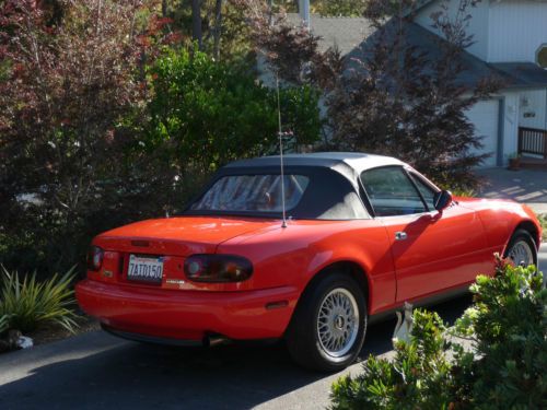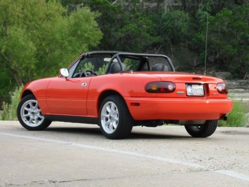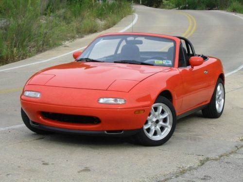 One in a Million: 1990 Mazda Miata Bright Orange Factory Color Test Car Truly one of a kind! To date, Mazda has produced approximately 960,000 Miata (MX5/Eunos) sports cars. Of this nearly-a-million quantity, this car is the only bright orange first-series (“NA”) Miata produced and sold by the factory. It’s one of the original Mazda Miata “Color Cars” that were selected by Mazda from the assembly line in 1990 to be painted alternate paint colors as full-scale marketing study for potential production. Viewing was held at the courtyard of Mazda North America HQ in southern California. There were six Miata color cars in all. The six colors were: • Raspberry Metallic The Light Green and Raspberry cars are now considered lost, so only the remaining four cars exist, and are all in long-term ownership. Two pictures from the original viewing of the Color Cars at Mazda in California are shown with this listing. On the window sticker, in the block "Color of Your New Mazda" it says "Various Test Colors". All six color cars received an "X1" for the color code, and the special color status is also noted on the original window sticker (which I have, along with many other records). These six special cars were removed from the assembly line and painted at the factory in Japan. The cars were painted completely so that the color is under the hood, inside the trunk and under the carpets. The color cars were then returned to the assembly line for completion and shipped to the Mazda design studio in Irvine, California for viewing. Sunkist (the orange car) spent some 14 months at the Design Center and accumulated about 1,400 miles. When they were finished with the cars, the Design Center offered them for sale to employees, and most were bought by employees or their friends. The orange car is an A-package car (power steering, leather-wrapped steering wheel, AM-FM cassette radio) with air conditioning. The Sunkist-orange car is perhaps the most famous of the six Color Cars, The paint is highly distinctive: bright-orange and very close to Lamborghini Miura orange. One of the Miata’s designers owned a Miura in that color, which is how it happened. A full history of the Color Cars (as written by others) is included at the end of this description. Here’s a link to the full set of (at least) 138 photographs: http://share.shutterfly.com/action/welcome?sid=0AYsm7dq0YsWLGig (Interior photos in the linked set are not too good so far– after I vacuum, clean, and re-photograph the interior and seats, new pictures will be added to the Shutterfly set and will be available using the link above. The interior’s actually in great original condition, with custom floor mats having the “Miata” logo stitched in orange) General Notes: