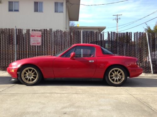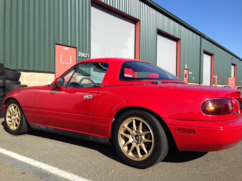 Perfect spec miata car has great handling package Clean title on hand SMOGGED 221k on Chassis 41,000 on rebuilt motor OEM hardtop NewBride low max bucket seats (replicas) NewNRG quick release steering hub New NRG 4pt harness (driver side only Factory seat belts mounted along side) New Racing Steering Wheel New Work Emotion wheels (replicas) 15x6.5 Racing beat lowering springs Koni Blue shocks Racing beat anti roll bars adjustable Rear subframe brace Stainless Steel braided brake lines Power slot brake rotors Hawk autocross pads Flying miata strut tower New clutch master cyl New slave cyl Poly Urethane front splitter Lightweight Odyssey Racing Battery JVC deck Ipod/iphone USB car handles great. very fun to drive and ready for the track! |