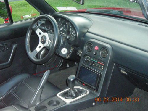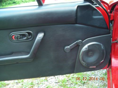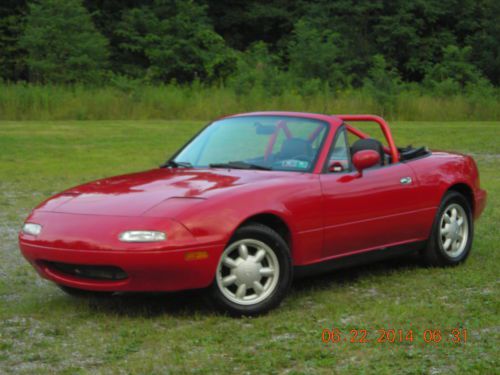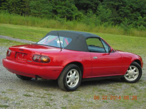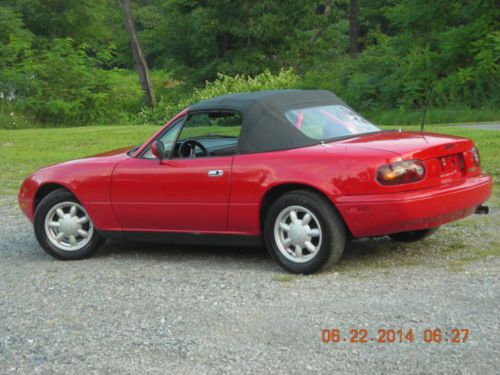 1992 MAZDA MIATA, CALIFORNIA CAR, IT RUNS AND DRIVES GREAT,ORIGINAL PAINT AND NO RUST, THE CLUTCH, TIMING BELT AND WATER PUMP WAS RECENTLY REPLACED ALONG WITH COOLING SYSTEM SERVICED, THE DRIVER SIDE FENDER WAS REPLACED DUE TO MINOR DAMAGE, FENDER DID NOT NEED TO BE PAINTED CAUSE IT COME FROM ANOTHER RED MIATA, NO CHECK ENGINE LIGHT OR ANY OTHER WARNING LIGHTS, IT HAS A BRAND NEW CONVERTIBLE TOP, THE PAINT IS IN NICE SHAPE, THE CAR DRIVES VERY TIGHT AND APPEARS TO HAVE BEEN WELL TAKEN CARE OF. THE INTERIOR IS IN GOOD SHAPE, THE DRIVERS SIDE SEAT SHOWS A LITTLE BIT OF WEAR BUT NOT BAD, PLEASE CALL ME AT 814-244-4007 IF YOU HAVE ANY QUESTIONS ABOUT THE CAR, THANKS FOR LOOKING AND GOOD LUCK WITH THE AUCTION.