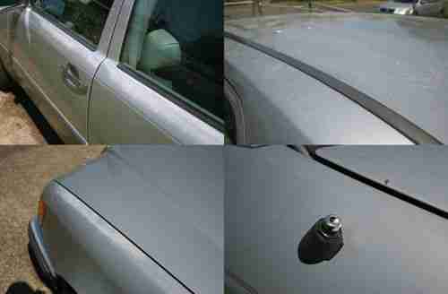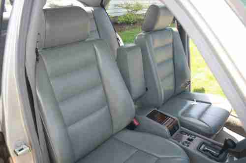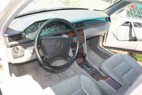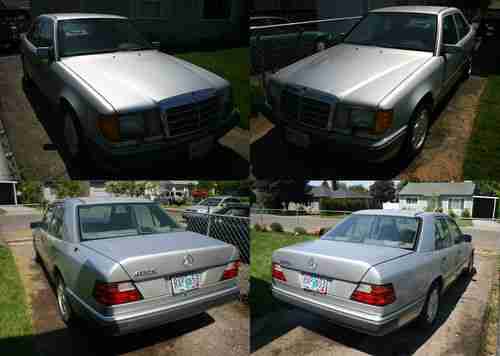 1993 Mercedes-Benz 400E, Silver (paint finish is worn by the sun, cracking pictured), Leather (tears on drivers seat [pictured] and cut out of sight low [next to console]), hood ornament included but removed.