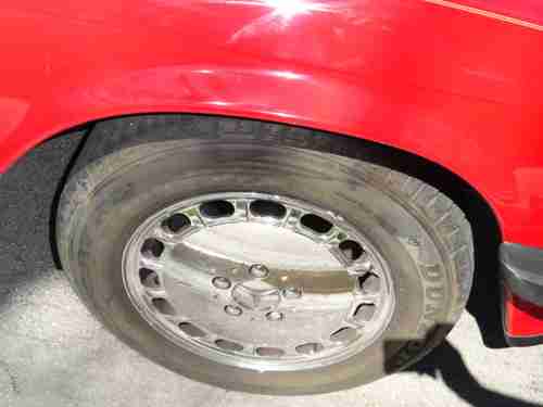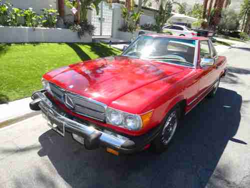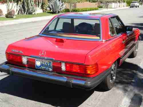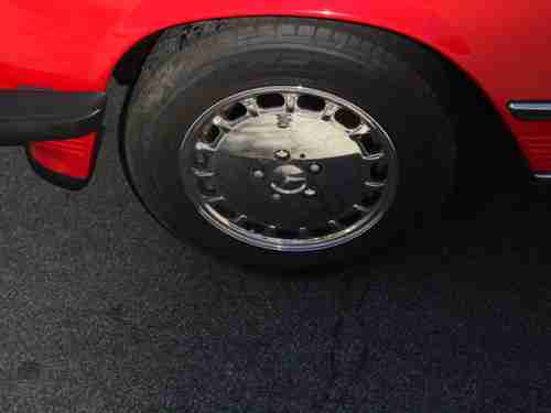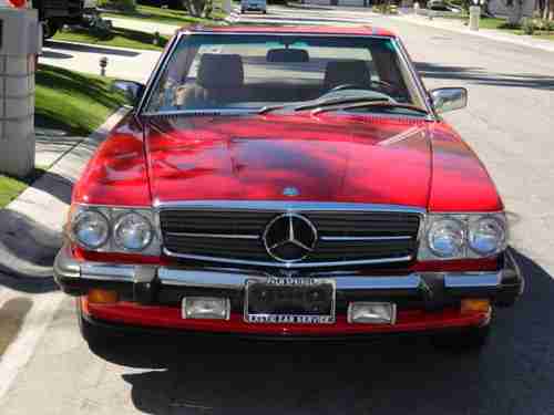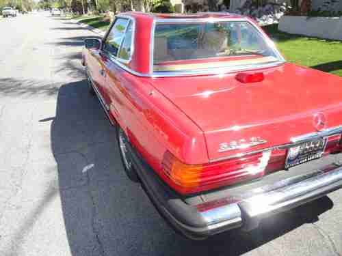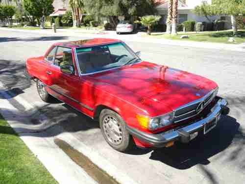YOU ARE LOOKING AT A CLEAN 1987 MERCEDES BENZ 560SL CONVERTIBLE WITH BOTH TOPS AND NEW RACK AND COVER FOR TOP. THE CLOTH TOP IS BLACK AND IS IN EXCELLENT CONDITION, THE EXTERIOR OF THIS CAR IS RED WITH A PALOMINO LEATHER SEATS AND TAN CARPETS. THE WOOD TRIM IS IN GOOD CONDITION AND IS A DARK COLOR. THE CAR HAS BEEN RECENTLY HAD A COMPLETE SERVICE ON THE MOTOR TRANMISSION WHICH INCLUDED ALL NEW HOSES, NEW MERCEDES BENZ FUEL PUMPS[ BOTH PRIMARY AND SECONDARY], ALL NEW BELTS, NEW ROTAR, DISTRIBUTOR CAP, NEW MERCEDES PLUGS AND WIRES NEW CONDESSOR. NEW MERCEDES BRAND ROTARS AND BRAKE PADS, FLUSH AND CLEAN RADIATOR CHANGE ALL FLUIDS AND FILTERS ,CHECK A/C, REPLACE CARRIER BEARING. THE CAR HAS NEW BATTERY AND EXCELLENT RUBBER, HAS UPGRADED CHROME WHEELS. THE PAINT IS IN EXCELLENT CONDITION ALTHOU THERE IS ONE SMALL DENT ON THE LEFT REAR BUMPER THE HALF THE SIZE OF ONES PINKY. THE INTERIOR OF THE CAR IS IN EXCELLENT CONDITION WITH A NICE PALOMINO INTERIOR, WHICH WE HAD SHEEP SKIN COVERS THAT WE JUST REMOVED. THE CAR HAS ICE COLD A/C AND FEATURES AN ALPINE CASSETTE STEREO PULL OUT SYSTEM. THE GLASS IS ALL IN EXCELLENT CONDITION EXCEPT FOR SMALL SURFACE SCRATCHES ON THE LEFT SIDE WINDOW FORWARD[ NOT NOTICEABLE] THE PAINT DOES NOT SHOW ANY CHIPS AT ALL. THERE ARE NO DISSAPOINTMENTS WITH THIS WELL SERVICED AND WELL CARED CAR. THIS ALSO A NON-SMOKERS CAR AND INCLUDES THE TOOLS TO REMOVE THE TOP.