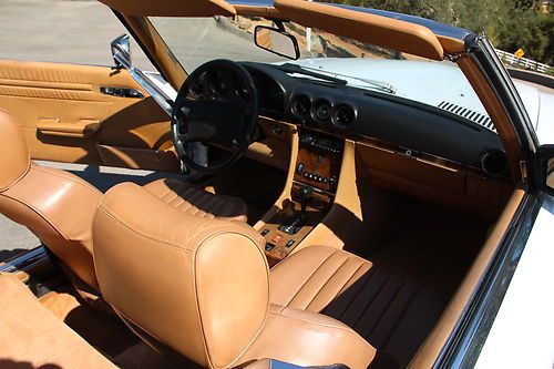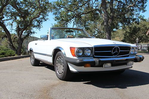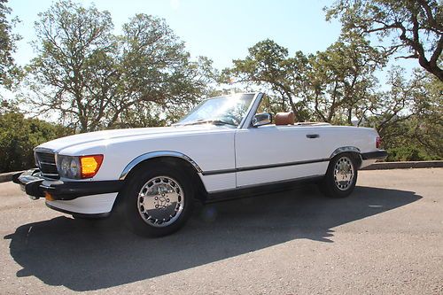 Previously loved, 1988 560SL Mercedes Benz. White exterior, tan leather interior, chrome wheels, dark chocolate soft top in great condition, white hard top with storage caddy. 127,000 miles, in great running condition. Updated stereo and speakers in original location. Comes from a smoke free environment. Beautiful car.
