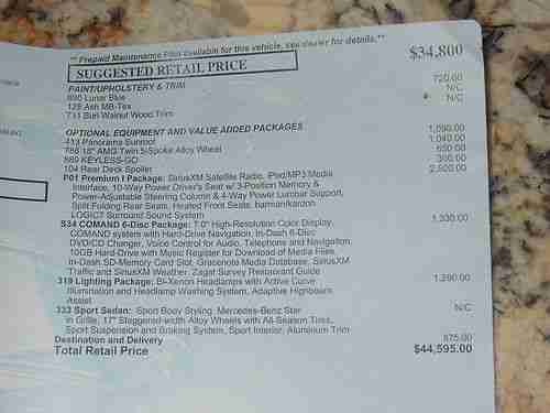 This car comes well optioned. The original MSRP was $44,595. Options on the car include: Panoramic Sunroof, 18" AMG Twin 5-spoke Wheels, KEYLESS-GO ignition, Rear Deck Spoiler, Premium Package (Premium sound Harmon/Kardon stereo with HD and and Sirius Satellite radio, memory for drivers seat, rear fold down seats, and heated front seats), COMAND 6-disc Package, with Navigation, Voice Control etc, Lighting Package (with Bi-Xenon driver adaptive lighting and head light washer system, and automatice high beams), Sport Package, and factory trunk liner. I have enclosed a picture of the window sticker for more information.