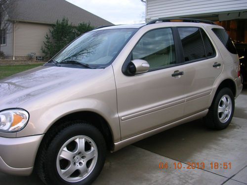 For auction is a beautiful 2003 Mercedes-Benz ML350 SUV. This vehicle was the wife's car and always garaged. Car Facts report included with this vehicle. NICE SUV!!!! Color is a champagne beige with two tone beige interior. Loaded with power and electric moon roof. Tires and paint are in good condition. Too many options to list. 232 Horsepower V6 engine with 125K miles which is nothing for a Mercedes. Body has a few very minor spots of rust at bottom. Cruise control needs repair and back wiper blade. Vehicle history report included. One minor front fender damage that was professionally repaired. If you have any questions, please call 330-989-3452 and ask for Chuck or Judy. Vehicle can be viewed outside of Youngstown, OH which is halfway between Cleveland and Pittsburgh. Thanks for looking.