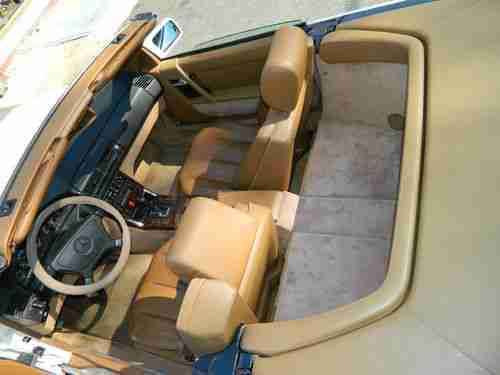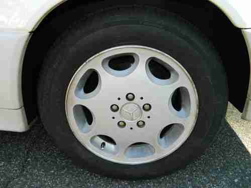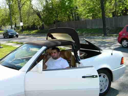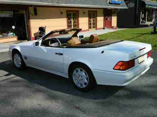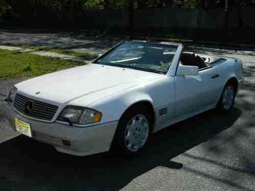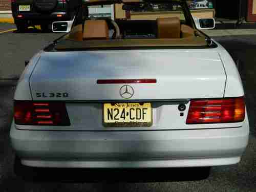 Up for a no reserve auction is a 1995 Mercedes Benz SL320 White Convertible Gold Package. I am second owner on this car and it currently has 87,642 original miles. It is white exterior with brown convertible top with Tan interior. I do have the original hard top also as well as the stand that holds it in my garage which will be included to the winning buyer. The car is fully loaded and has the gold package which is the gold Mercedes Emblem with the Gold letters on the back. Car has power heated seats, Heat/AC, power doors & windows, original wheels with brand new tires which were installed about a month ago alond with new rotors and brakes. The car does need a little work but it is minor. There is few dings, scratches and little rust spots as seen in the pictures but no major dents or rust. The driver seat is severely damaged. The driver door speaker cover is broken. The convertible top will need to replace all plastic windows as they are ripped very badly. The car drives very nicely and is very powerful.