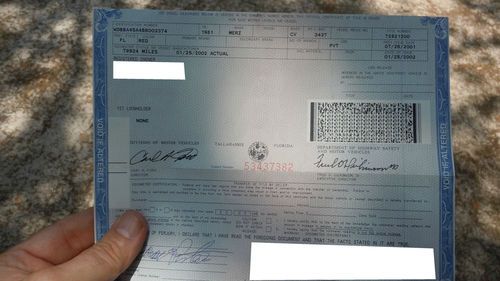 The speedometer works, but the odometer does not. Owner did not know that it was no longer working so I don't know for how long it has been out of commission. However, I included a photo of the title which states that in 2002 it had about 79,000 miles. So, considering that the car was only used on sunny weekend days and not much for the past couple of years, I can fairly conclude that this Benz should not have much more miles than the presently indicated ones on the odometer. It's a shame that her ex-husband is no longer around because I feel that there's a bigger story about all the work done to this Benz!