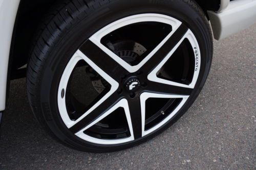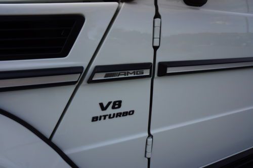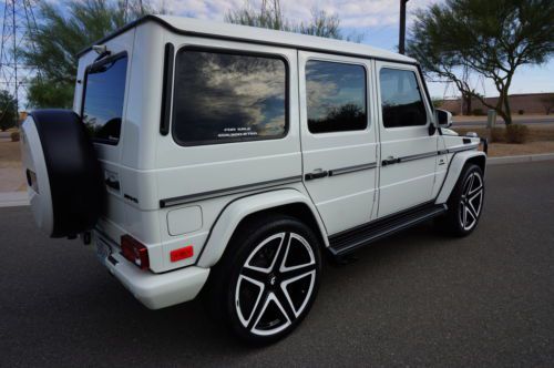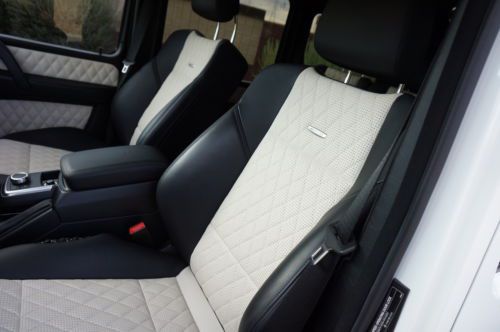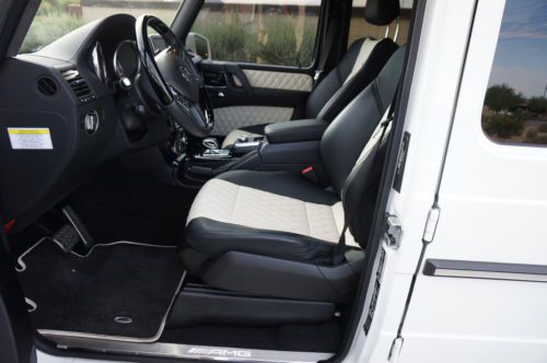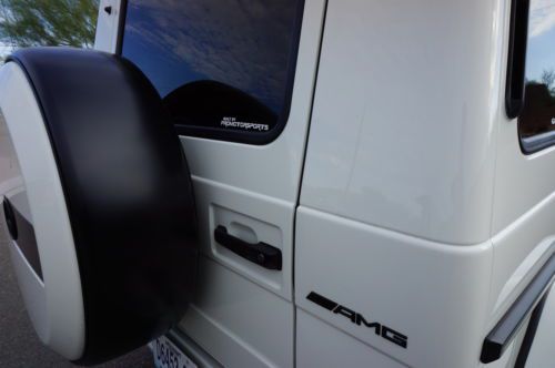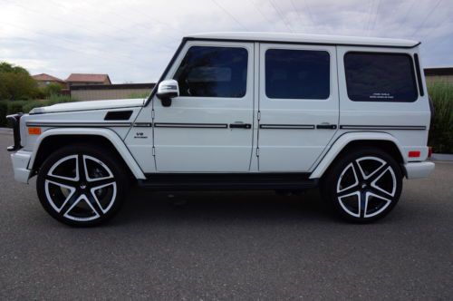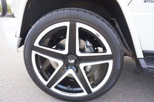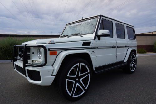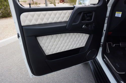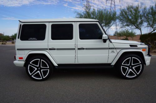 2013 Mercedes Benz G63 customized by Pro Motorsports. This G wagon is finished in white and has black leather with ivory inserts that are cross stitched designo interior. These are iconic vehicles for villians and superheros alike. This G63 was take to the next level by Pro Motorsports. All of the chrome has been blacked out. The chrome was powder coated. This includes brush guard, side steps, spare tire carrier, and exhaust tips. The logos and small parts were painted black. These include v8 bi turbos from the sides, g63 and amg from the rear, mercedes logo and grill surround from the front. Forgiato wheels custom painted to match a set of 24" monoblocks. They are wrapped in pirelli tires. If you are looking to not be noticed, this is not the vehicle for you. If you want to stand out from the crowd, this G wagon could be perfect. This suv is in our showroom in Scottsdale. If you are in the area, we would love for you to stop by and see it. Call or email with questions. 602-300-8720 or sales @ promotorsports .com