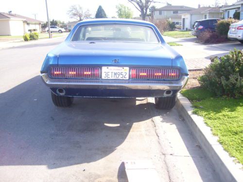 UP FOR BIDS IS A 1968 COUGAR MANUAL WITH T5 4 SPEED. I STARTED RESTORATION AND WAS DISASSEMBLED FOR PAINTING,THE ORIGINAL 302 WAS STOLEN WHILE THE ENGINE BAY WAS DRYING SO I LOOKED FOR SAME ENGINE BUT COULD NOT FIND A TRUE MANUAL ENGINE,ALL THE 302 I FOUND WERE EITHER FROM AN AUTOMATIC OR MANUAL FROM A TRUCK, I FOUND A 1970 COUGAR WITH ORIGINAL 351 WINDSOR MANUAL TRANSMISSION CAR SO I INSTALLED IT AND DROVE IT. BEFORE THE PAINTING,THE BODY HAS SURFACE RUST AND WAS SANDED AND PRIMED. I NEVER FINISHED INSTALLING THE NEW HEADLINER,THE CARPET IS DECENT, THE UPHOLSTERY NEEDED REPAIR DUE TO SOME IDIOT PUTTING HEAVY SHARP PARTS ON TOP OF THE SEATS AND RIPPING THEM,INSTALLED A NEW REAR VALANCE BECAUSE THE OLD ONE WAS STOLEN AS WELL,THE BUMPERS ARE DRIVER QUALITY,NOT RUSTED. I STRIPPED THE TRUNK FLOOR AND SPRAYED WITH BEDLINER.THIS WAS AN ORIGINAL BABY BLUE CAR. THE WHEELS ARE SLOTTED MAGS CORRECT ERA OPTION AND BRAND NEW TIRES. HAS LONG TUBE HEADERS AND CHERRY BOMB PIPES. I HAVE STARTED THE CAR HERE AND THERE AND MAY NEED TUNE UP, BASICALLY I JUST LOST INTEREST DUE TO STOLEN ORIGINAL PARTS LIKE THE DASH PANEL,THE EMBLEMS. THE TRIMS ARE COMPLETE THOUGH AND ,THE DASH PAD IS NICE ,TRANSMISSION HAS LESS THAN 1000 MILES IN THE REBUILD. THIS IS ONE OF THE RARE MUSCLE CARS, THERE ARE A LOT OF COUGARS OUT THERE BUT ARE EITHER AUTO OR 3 SPEED,THIS ONE IS A FACTORY 4 SPEED . GLASSES ARE GOOD. MAY NEED A SMALL PART HERE AND THERE BUT NOTHING MAJOR. R DOOD WAS SCRATCHED BUT I REALLY LOST INTEREST IN FIXING.