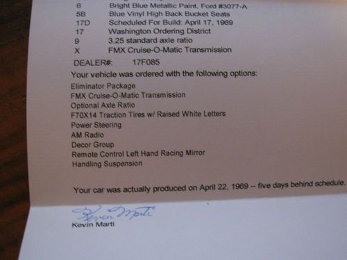 Here is a 1969 Mercury Cougar Eliminator body shell with some of the Eliminator parts including the hood scoop, the original rear plastic spoiler and the original fron chin spoiler. Both spoilers are damaged but could possibly be repaired. This car was delivered in North Carolina and has a clear North Carolina title and the original owners manual. It was a blue blue car with an automatic and a Windsor four barrell engine. It has been hit in the passenger quarter and fixed at one time and also got a bump in the rear. I used to restore Mustangs and Cougars but got burned out when prices went nuts. This car is shell only and what you see is what you will get. I will not in any way ship this car. You will have to pick it up. I will not sell any parts away from this car and I will not do a buy it now. It will need a full restoration and a lot of parts but for what I am starting this at the hood scoop is worth more. It will need at very least a passenger quarter, two doors,a hood and trunk lid and an engine and tranny and all the glass and all the interior. I have a bunch of small leftover stuff for Mustangs and Cougars that will go with it.Nothing really valuable just stuff. I have the Marti Report for this car also. It has been stored inside for over 10 years and now it is outside so it is time to go. It is a restorable car but is pretty beat up. Remember that I will not ship this and it must be picked up. It can stay where it is at for a month and then it must go.