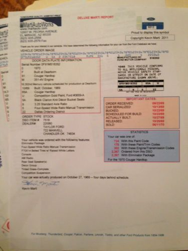 1970 Mercury Cougar Eliminator with original 351 C engine and 4 Speed Hurst. Have full documentation from Marti Report showing every option the car came with including factory Competition Gold paint. I bought this car from a man in Oklahoma City that had owned the car since the mid 70s. His grandfather had bought it new and lost interest and gave it to him. I even have a copy of the old brown title from when they signed it from the grandfather to the son. He told me it was driven up until the mid to late 90’s and then parked. It was painted in the early 90’s and it is a driver quality paint job with usual chips and imperfections. This car runs great and drives great too. The only issue is it has is a slight drain on the battery if you leave it hooked up and a slight exhaust leak. Other then that this is a wonderful running and driving car. This car is very rare and you would have a hard time finding another 4-speed competition Gold car with its original engine and transmission. Here is a run through of every aspect of the car: |