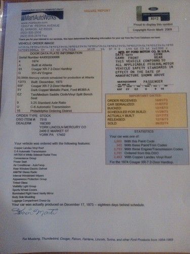 You are looking at a rare 74 Cougar here. Bought this car exactly one year ago with the intention of fully restoring it. Car is all original with 52K on a rare 351 Cobra Jet 4BBL. Original rare paint code (see Marti Report) Body is perfectly straight with no dents, interior is in perfect shape with no rips, cracks or tears. Interior is a beige corderoy type material that will be perfect once steam cleaned. No stains. I honestly have not even cleaned the interior since I bought it. Car is completly rust free except for a rust spot about the size of a quarter near the bottom of the rear finder behind the back passenger tire. Floors, trunk are solid and rust free. All chrome is in great shape. Believe that that the AC will blow cold with just a charge. I also was planning on replacing the Vinyl top as well as it has a few cracks behind the chrome moulding on it. This is an original owner car from Pennsylvania. Previous owner in Texas bought it at an auction when it was traded in by the orignal owner. He then turned it around after a year and I picked it up last May. I have basically done nothing with the car except change all fluids, belts, hoses. Selling as my true passion is to own a 71-73 Cougar - willing to consider for a trade as well. Runs excellent, transmission is smooth, great suspension, power steering, dual exhausts. This is quite a bit of a car for the money and would not take much to restore this cat to it's original beauty. Car is beautiful even in it's current shape but my original goal was to bring it back to show room condition. Please let me know if you have any further questions.