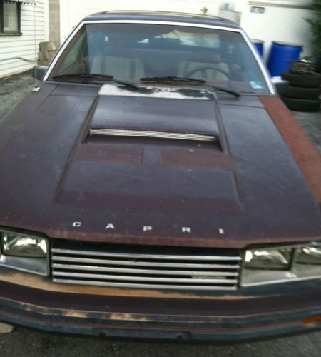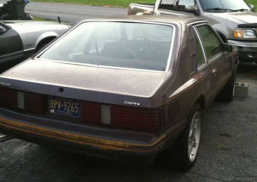 Selling a 1982 Mercury Capri 5.0l 5spd. The car is all original with the exception of the rear spoiler that wa added. I do have the factory hupcaps for it but I believe there is one missing. Car does have a sunroof and factory hood scoop. The car does need a few things. it needs a battery and I believe a starter. it did run great. It also needs a brake line repaired and the front frame rail on the passenger side it rotted away under the shock tower. If you have questions please email. Thanks.
