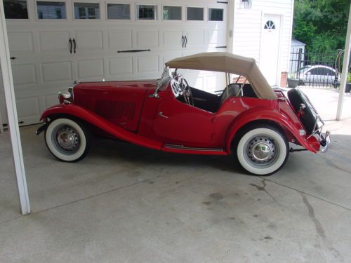 1953 MG-TD 2 Roadster RARE Edition, Red with tan interior and tan convertible top with matching side curtains. Matching Numbers Engine XPAG/TD/2 29754 1250 cc Older restoration with 5,894 miles since restoration and restoration receipts. Exempt SC Title. Great for shows or driving. Lots of documentation and restoration receipts. An Excellent investment opportunity for a RARE MG-TD-2 MG-TD Serial Number 29671. Built February 22, 1953. Production of the D series ceased August 17, 1953 the last serial number was 29915. This is one of only 157 cars shipped to the United States in 1953. The "LIEON" series. A rare variety of TD, very few ever built. They were characterized by the Burl Elm veneer dash board and Damascening (engine turning) of the instrument panel. Indentified by the GOLD LION CREST on the glove box door. History: The car was shipped into Houston Texas in March of 1953. The first owner is believed to have been a NASA Astronaut subsequently transferred to Goddard Space Flight Center in Beltsville, MD in the late 60's It was acquired by Motorhead and sold to Mr. Robert Runyon of Waldorf MD in 1970. It remained in storage for 18 years then restored in 2000. The restoration is still very nice with minimal wear. Ships Worldwide. For additional photos or questions call us at 864-579-7763 Note: This vehicle is for sale locally in our showroom and we reserve the right to end the auction early if it sells locally. |