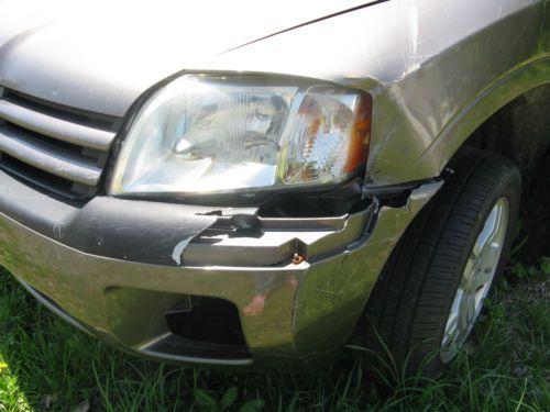 Hello everyone! Please read this entire description so you don't miss the important details. This is going to be a long story, but I believe in being truthful about the issue with this vehicle. It is a 2004 Mitsubishi Endeavor LS AWD 4-Door Sport Utility Vehicle. This is owned by my 77 year old father who purchased it pre-owned well over 5 years ago. It has somewhere between 124,000 to 125,000 actual miles on it. Back in February of this year, he had Cataract Surgery and unfortunately reacted adversely to his medication, found his keys and took this vehicle out and made it about 1/2 miile down the road and took out a barb wire fence. Before this happened, the vehicle ran fine and was in pretty good condition with minor scuffs and scratches. We also had just put almost $500 in brake work(new brakes/labor) put into this vehicle before this happened. Ever since the accident we can't get the vehicle to start. It might be an inertia switch but no one seems to have an answer or everyone seems to have a different answer! We know it is not the battery because it can be charged since sitting and it still won't start. My dad has decided to just get rid of it if he can and find something else because we price parts and they are just too high. NOW to the body damage! I have pictures and am not sure if you can see them well. The major damage is the bumper, headlight, fender, driver door and there are pieces gone on the right top ski rack. I believe other than that, there are scuffs and scratches. Please don't hold me to it but I am looking at it right now and think that is accurate to say. The tires have gone flat from it sitting since February as they were not flat when it was towed here. The person who towed it left it on a slant and it has been hard really getting to it to do anything anyways. I hope this all makes sense and I apologize for the long drawn out saga. We hope someone will be interested in this. If you have any questions PLEASE feel free to ask and I will do the best I can to answer them. Before this vehicle was wrecked, I loved driving it. It had some power and it was really nice as far as I am concerned. I would think someone could fix this ans drive it however there are tons of parts on this vehicle that are very usable if you just need parts. OH I FORGOT, the drivers side mirror was completely torn off and we could not find it. As I said, please don't hold me responsible for any mistakes as I have tried and will continue to try and give you accurate information. Thank you!