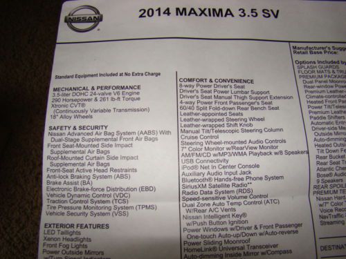 Hi There.I am Selling my 2014 Nissan Maxima SV with only 700 miles on it.I just bought this Car about a month ago,But i am selling it now i have some personal reasons.So my loss is your gain,Don't miss on this one.The car is equiped with (PREMIUM PACKAGE) THAT COST $2850....SPLASH GUARDS $185...FLOOR MATS &TRUNK MAT(5 PIECE SET) $195.....REAR SPOILER $380....(PREMIUM TECHNOLOGY PACKAGE $1150.....IF YOU HAVE ANY QUESTIONS PLEASE CALL ME @ (513)633-1244.MY NAME IS SALEH HATTER.OR YOU CAN EMAIL THROUGH EBAY.Thanks for looking and good luck.