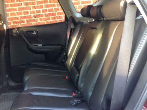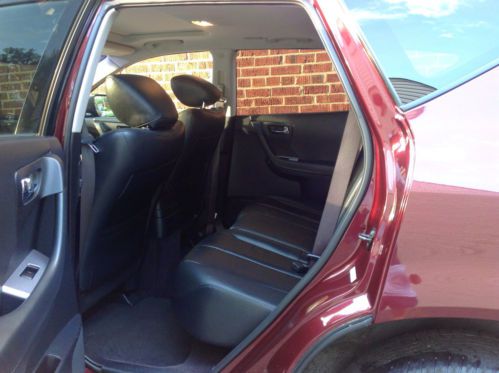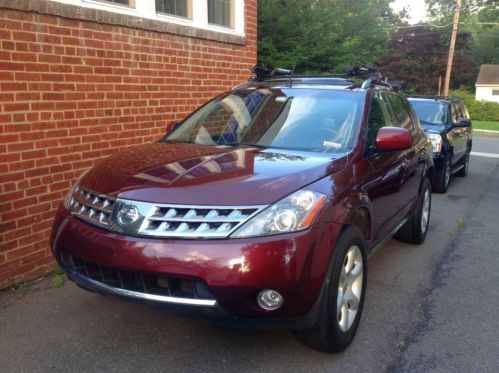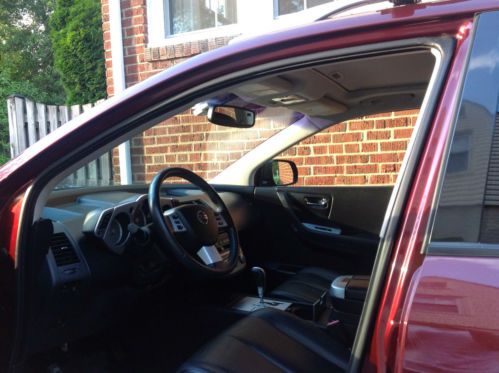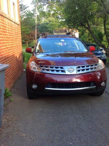 A five-passenger car-based SUV, this fully-loaded, rare Merlot Pearl color 2007 Nissan Murano SE (upgraded from the S and SL models) includes 18-inch alloy wheels, charcoal leather upholstery, dual-zone automatic climate control, steering-wheel-mounted audio controls and full power accessories, 10-way power-adjustable driver seat with power lumbar, sunroof, heated outside mirrors, keyless startup, heated front seats, a 225-watt Bose stereo system with an in-dash CD changer, navigation system, an auto-dimming rearview mirror, sport-tuned suspension, xenon headlamps and a rearview camera. Thule cross bars with two bike racks included. Has one small dent on passenger rear door. Purchased as fully-loaded dealer car at Nissan Dealer; original owner. All routine and recommended maintenance conducted at Nissan dealer. Records available. |