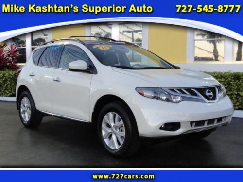 2011 NISSAN MURANO SL, ONLY 20K MILES, CARFAX ONE OWNER, PWR SUNROOF, LEATHER INTERIOR, BACKUP CAMERA, BLUETOOTH, HEATED SEATS, KEYLESS ENTRY, 2ND ROW FOLDING SEATS AND SO MUCH MORE! Why buy from us? Mike Kashtans Superior Auto Sales is a family owned and operating Automotive Dealership located in Pinellas Park, Florida. We are celebrating our 30th year and have proudly served the Tampa Bay, St. Petersburg and surrounding areas since 1983! We BUY & SELL clean, quality used cars, trucks, vans and SUVs! All of our Vehicles come with a Free Carfax Report and a 30 Day or 2000 Mile 100% Parts and Labor Limited Powertrain Warranty! We sell more then just cars, we offer the added value and quality that makes our dealership different from the rest! Our team is professional, and we offer a relaxed, stress free, no hassle environment! We would also like to encourage you to use the expertise and resources we have to offer as we have access to over 25 financing sources serving customers with excellent to credit challenged ratings! Our Credit Unions are currently offering rates as low as 2.99% APR! Looking to sell/ trade your car? Sell your car for cash today... Mike Kashtans Superior Auto Sales is also the Tampa Bays leading used car dealership when it comes to buying your car. We're always looking for quality pre-owned cars to sell, and it doesn't matter how old or new it is. Bring your vehicle by our Pinellas Park, FL location and let us have a look at it, ALL Makes and Models are accepted, we will make you an offer and pay you CASH on the spot! Trade-Ins are always welcome and often offered to the public at wholesale prices! Stop by our dealership today or give us a call @ 877-740-0266. You can view our inventory @ www.727cars.com Looking to sell your car? Sell your car for cash today... Mike Kashtan's Superior Auto Sales is also the Tampa Bay's leading used car dealership when it comes to buying your car. We're always looking for quality pre-owned cars to sell, and it doesn't matter how old or new it is. Bring your vehicle by our Pinellas Park, FL location and let us have a look at it, ALL Makes and Models are accepted!