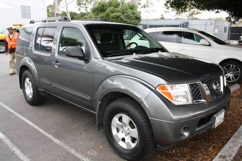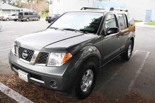 This 2006 Nissan Pathfinder 4dr LE SUV features a 4.0L V6 SFI DOHC 24V 6cyl Gasoline engine. It is equipped with a 5 Speed Automatic transmission. CLEAN TITLE. FEATURES and OPTIONS This vehicle comes equipped with Air Conditioning, Cruise Control, Power Steering, Power Windows, Power Door Locks, Power Mirrors, Power Passenger Seat, Tow Package, Roof Rack, Rear Air Conditioning, Tachometer, Tilt Steering Wheel, Steering Wheel Radio Controls, Driver Airbag, Passenger Airbag, ABS Brakes, Rear Defogger, Intermittent Wipers, AM-FM, CD Player, Cloth Interior Surface, third row seat, very clean, you have to see, Shows great! A/C is ice cold! Power everything! clean interior. Runs great and drives excellent. Smooth as silk! AM/FM stereo CD player Factory rims! Price $12,700 Mileage 96,088 Body Style Sport Utility Exterior Color Charcoal Interior Color Gray Engine 6 Cylinder Transmission Automatic Drive Type 2 wheel drive Fuel Type Gasoline Doors Four Door 3rd Row Seats CD Player Cruise Control * ,You are welcome to bring in your certified mechanic for inspection before purchase, am flexible on the price however please make it reasonable, A very reliable car, GREAT ENGINE AND TRANS PRIVATE SELLER, SERIOUS BUYERS ONLY, NO TRADES, CASH ONLY!!! - MUST GO!! .call (951) 243-4013 HABLO ESPA~NOL. There are no electrical problems with this vehicle. No defects. There are no problems with the engine. This vehicle has a clean exterior. The inside of this vehicle is smoke-free. Clean interior. The mileage represented on this vehicle is the actual current mileage. The transmission shifts like it was new.