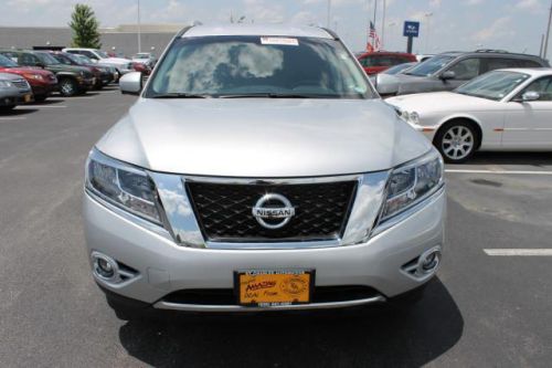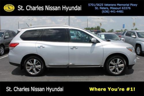 I present to you the completely redesigned 2013 Pathfinder. Shown here in Brilliant Silver this Platinum model is everything you could want in a 7-passenger SUV. Powering this machine is the 260-Horsepower 3.5L V6 which is mated to Nissan's Xtronic CVT. Together, they help you to achieve up to 26mpg but also allow up to 5,000 pounds in towing capacity. Outside, the aerodynamic exterior features stylish 20-inch aluminum-alloy wheels, fog lights and tow hitch receiver w/7-pin wiring harness. By checking out our pictures, you will see the leather-trimmed cabin is just as stylish as the exterior. Features like Nissan's Intelligent Key w/Remote Engine Start, Bluetooth hands-free phone system, a hard drive navigation system and the innovative Around View monitor are all included. The Bose AM/FM/CD audio system features auxiliary audio/video input jacks and USB connection port giving you plenty of ways to listen to your tunes. With all three rows occupied, you can still manage to fit up to 16 cubic feet of cargo. Vehicle Dynamic Control, Traction Control System, and six airbags are just a couple of the more than 50 standard safety features you will find in the Pathfinder. The time has come to treat yourself to an SUV that doesn't punish you at the gas pump or in the 3rd row seat. Print this page and call us Now... We Know You Will Enjoy Your Test Drive Towards Ownership! Another Amazing Deal We carry the largest Nissan and Hyundai inventory in the state of Missouri and back up our commitment to offer the greatest selection and purchasing convenience to our customers. You will find no dealer mark-ups or addendums to the manufacturer's sticker prices here. We mean it when we say "No Gimmicks - No Games!" We attempt to make your buying experience straight-forward.