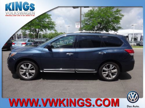 4WD. Won't last long! Stroll on down here! Want to stretch your purchasing power? Well take a look at this terrific-looking 2013 Nissan Pathfinder. This SUV is nicely equipped with features such as 4WD, 3rd row seats: bench, 4-Wheel Disc Brakes, ABS brakes, Air Conditioning, Automatic temperature control, Brake assist, Bumpers: body-color, CD player, Driver door bin, Driver vanity mirror, Dual front impact airbags, Dual front side impact airbags, Electronic Stability Control, Four wheel independent suspension, Front anti-roll bar, Front Bucket Seats, Front Center Armrest w/Storage, Front dual zone A/C, Front reading lights, Illuminated entry, Low tire pressure warning, MP3 decoder, Occupant sensing airbag, Outside temperature display, Overhead airbag, Overhead console, Panic alarm, Passenger door bin, Passenger vanity mirror, Power door mirrors, Power steering, Power windows, Rear air conditioning, Rear anti-roll bar, Rear reading lights, Rear seat center armrest, Rear window defroster, Rear window wiper, Reclining 3rd row seat, Remote keyless entry, Security system, Speed control, Speed-sensing steering, Split folding rear seat, Spoiler, Steering wheel mounted audio controls, Tachometer, Telescoping steering wheel, Tilt steering wheel, Traction control, Trip computer, Variably intermittent wipers, and Voltmeter. You just simply can't beat a Nissan product. Great vehicles at a fantastic value! ****Cincinnati's World Auto CPO Dealer**** Experience the Kings VW difference! Free Blackbook/KBB online appraisals @www.vwkings.com! Thanks for looking at our vehicle. We look forward to working with you either over the internet, phone or directly in person. Come to our all-new expanded facility in the Kings Auto Mall& have a great car buying experience. We're easy to find and easier to love! Great vehicles at a better value @ Cincinnati's #1 VW World Auto Certified Pre Owned Dealer!
