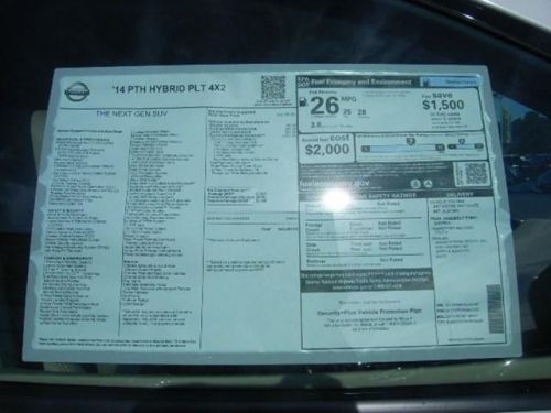 This vehicle has MSRP of $46,460, Priced below MSRP!!! The price is the only thing that's been discounted on this solid SUV!! Awesome!! This solid Pathfinder Hybrid seeks the right match!! This 2014 Nissan Pathfinder Hybrid Platinum is nicely equipped with optional equipment such as: Platinum Premium Package, Carpeted Floor Mat (4-Pc Set), Black Splash Guards (Set of 4)... We have Excellent selection of new Nissan Pathfinder Hybrid in stock. Please be sure to contact VICTOR, Internet Sales Manager for Professional and No Pressure purchase, additional information and/or pricing on any model Nissan that you are interested in. **** Our goal is to provide the same rich, satisfying experience online that you will receive in our dealership. We pride ourselves on delivering the exceptional treatment customers expect. **** PLEASE Contact - VICTOR Internet Sales Manager for details at 888-505-5074 Thank you for visiting our website.