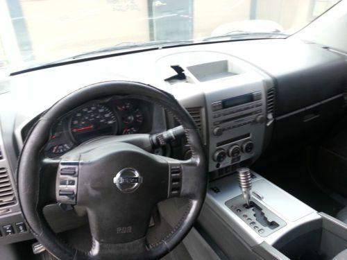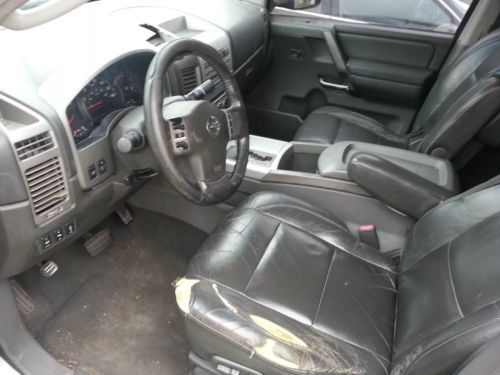 | 2006 Nissan Titan Crew Cab 4 door LE Silver 4 Door Pickup  5.6 L V8-cylinder engine with 5 Speed Automatic Transmission  2wd suspension Tires will need replacing sooner or later This is a non-smokers vehicle Takes Regular Gas CD player Radio 135,000 miles only Has two sets of keys and remotes.  This Titan drives well with no problems, engine light is on. This vehicle is LE edition with black leather interior, towing package with wiring, power sliding rear window, power windows and power locks, OEM Rockford Fosgate stereo system, rear parking sensors, running boards. Engine and Transmission work Great. It came loaded with these standard features and more: Electric Windows Electric Door locks Electric Door Mirrors Tilt Steering Wheel Electric Drivers Seat and passenger seat Heating and Air Conditioning Anti-Lock Brakes Air Bags Factory Security System Leather seats Rear power sliding window Cruise Control  Fog lights Adjustable Pedals Memory seats Steering wheel controls Digital top tempertaure gauge Rear exterior truck bed compartment Tailgate bedliner Heat warmer seats and more… (KBB VALUE OF THIS VEHICLE IN FAIR PRIVATE VALUE IS : $9,500) Flaws that I noticed by me personally: Front windshield needs replacing, front right passenger window does not work, driver leather seat has big slash and a lot of wear, rear right small window on rear back is shattered, steering wheel leather is worn, center dash piece that goes around radio is cracked, missing two front bumper filler plastics that go under each headlight as pictured, tires are in decent condition. This is nothing major to replace or fix but just things I listed here. Own this vehicle at low price and have it looking perfect with minimal expense. Car will be Sold as Is, This is a Dealer Repo. Immediate Deposit of $200.00 thru PayPal, Buyer must pay in cash or certified check and pickup Car in person within 7 days.  This is being sold by dealer and there are no extra or hidden fees. You pay nothing extra but price of vehicle and to title the vehicle in your name in this state or in your state.