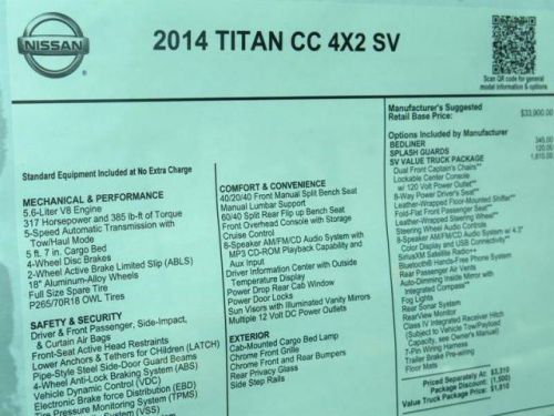 The 2014 Nissan Titan is a full size truck with aggressive looks and the capability to back it up. It's edgy angles give the exterior a tough appearance, and that feel is complimented with an interior that is straight forward, pleasantly simplified, and easy to maintain. Sold in two sizes, the King Cab and Crew Cab, they have seven trims between them. Further, depending on which you buy, you will have the ability to transport up to 5 or up to 6 passengers. Standard among all models and trims is the impressive 5.6-Liter V8 Engine with 317 Horsepower and 385 lb-ft of torque, and a 5-Speed Automatic Transmission. Also standard are Anti-Lock Brakes, Traction Control, Vehicle Dynamic Control, Variable Assist Power Steering, Tire Pressure Monitor, and Locking Tailgate. Power Windows and Automatic Power Door Locks are offered on all trims except the Base King Cab S. The Titan has various sound systems available depending on what model you purchase as well. The King Cab and Crew Cab S Trims give you an AM FM CD radio, and the SV and PRO-4X Trims in both sizes are offered with an AM FM CD MP3 system. If you purchase the top-of-the-line Crew Cab SL, prepare to be amazed when you listen to the Rockford Fosgate Stereo with Subwoofer. Shoppers have the option between two-wheel drive and four-wheel drive on both the King Cab and Crew Cab and all trims except the PRO-4X trims, which are offered exclusively in 4WD. Also available for all trims is the 5.6-liter, Flexible Fuel V8 Engine. Fuel economy between the King Cab and Crew Cab is the same, but the best performer is the Gas Engine with 2WD on either which gets an EPA estimated 13 MPG City and 18 MPG Highway. The best Fuel Economy with the Flexible Fuel engine is when you buy it in 2WD in which case you get 9 MPG City and 13 MPG Highway. The 2014 Nissan Titan is an amazing truck. Come drive yours today. Wesley Chapel Nissan offers a great selection of cars, trucks, and sport utilities. Our Internet Pricing policy offers low prices, plus we offer a wide variety of financing terms. Call our Internet Sales Team @ 866-913-9478 day or night ! Print this page out and present to a Internet Sales Team member and get a extra $250.00 off!