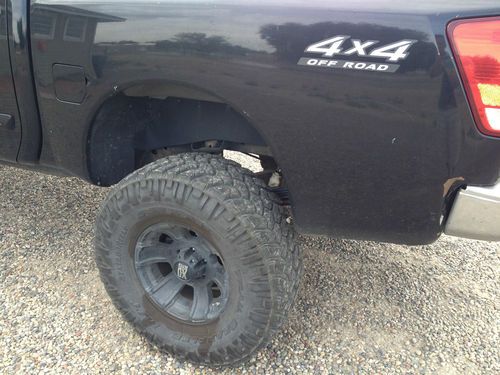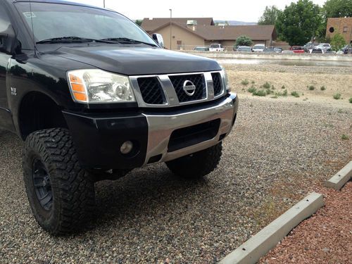 Lifted Nissan Titan for sale in great shape black on black. 9" lift (6" suspension, and 3" body), Black revolver rims, full tinted windows, black spray bed liner, This is a great looking truck. Lift was professionally done, and rides great. Overall truck is in great shape a few scratches and wear tear on the drivers seat. Took off truck tail gate for easier access. Tires have great treed and have full sized spare. Bumpers has a couple little bumps but nothing big (see pics). Truck tows great, and truck has been serviced to specs. Only serious bids please. Call or email with questions.
