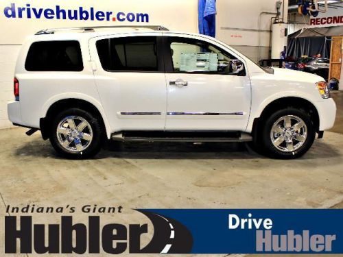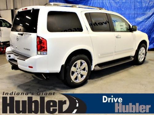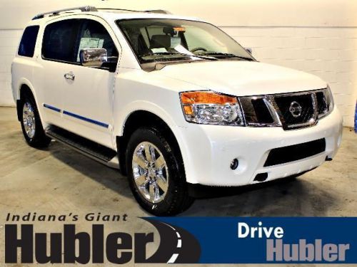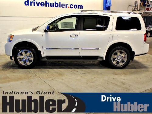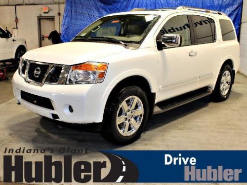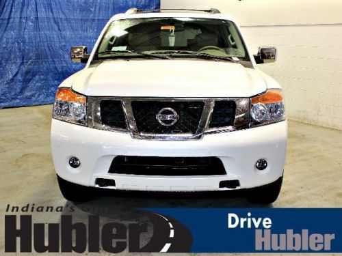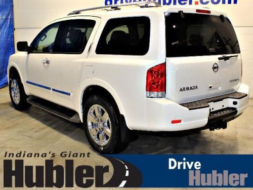 3rd Row Seat, DVD, Sunroof, NAV, Heated Leather Seats, Overhead Airbag, Four Wheel Drive, [L92] FLOOR & CARGO MATS (5-PIECE SET... [X01] 2ND ROW CAPTAIN SEAT PACKAGE. Pearl White exterior and Almond interior, Platinum trim. AND MORE!======KEY FEATURES INCLUDE: 3rd Row Seat, Navigation System, Entertainment System, Power Liftgate, Rear A/C, Heated Front Seat(s), Heated Rear Seat(s), Back-Up Camera, Premium Sound System, Satellite Radio, Auxiliary Audio Input, Bluetooth Connection, Tow Hitch, Multi-Zone A/C MP3 Player, Sun/Moonroof, Four Wheel Drive, Aluminum Wheels, Privacy Glass. ======OPTION PACKAGES: 2ND ROW CAPTAIN SEAT PACKAGE: 2nd row captain seats and 2nd row center console w/padded armrest, Seating reduced from 8 to 7 passengers, REAR CARGO NET & ORGANIZER, FLOOR & CARGO MATS (5-PIECE SET), ALMOND, LEATHER-APPOINTED SEAT TRIM: Front and 2nd row seats, PEARL WHITE. Platinum with Pearl White exterior and Almond interior features a 8 Cylinder Engine with 317 HP at 5200 RPM*. ======EXPERTS CONCLUDE: KBB.com's review says Nissan's 2014 Armada's interior is designed to adapt to multiple needs, able to shuttle up to eight passengers, or just two people and 97 cubic feet of assorted cargo.. ======WHY BUY FROM US: After more than 50 years in business, The Hubler Auto Group, through the power of ten central Indiana locations, has literally sold hundreds of thousands of vehicles and is one of the oldest and most prolific auto dealers in the State employing 550 people. The Hubler Auto Group can claim the title for selling more G.M. vehicles in the State of Indiana than any other dealer or dealer group, and has earned the right to brag of having the largest and most loyal customer Horsepower calculations based on trim engine configuration. Please confirm the accuracy of the included equipment by calling us prior to purchase. Hubler Nissan is committed to providing the finest automotive ownership experience through superior customer service. Let us make you a "Customer for life". We have 99% Guaranteed Credit Approval! For more details or to schedule an appointment, call us at 888-548-9398.