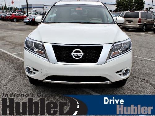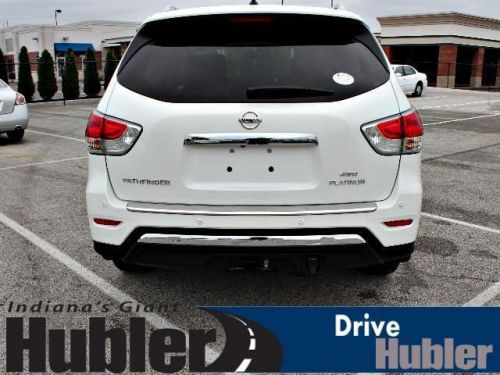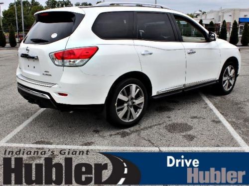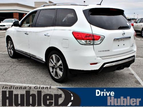 Third Row Seat, Moonroof, Nav System, Heated Leather Seats, Entertainment System, Head Airbag, 4x4, Power Liftgate, Hitch. FUEL EFFICIENT 25 MPG Hwy/19 MPG City! Platinum trim, Moonlight White exterior and Almond interior READ MORE!======KEY FEATURES INCLUDE: Third Row Seat, Navigation, Power Liftgate, Rear Air, Heated Driver Seat, Heated Rear Seat, Cooled Driver Seat, Back-Up Camera, Premium Sound System, Satellite Radio, iPod/MP3 Input, Bluetooth, Trailer Hitch, Remote Engine Start, Dual Zone A/C. Rear Spoiler, MP3 Player, 4x4, Aluminum Wheels, Keyless Entry. ======OPTION PACKAGES: PLATINUM PREMIUM PACKAGE: Tri-Zone Entertainment System, dual head restraint-mounted 7 monitors, 2 wireless rear seat headphones, wireless remote control (x1), VTR jack (x1) and rear auxiliary audio/video input jacks w/volume control, Dual Panorama Moonroof, one-touch tilt/open/close controls (front), sunshade and rear roof glass w/power sunshade, CARGO PACKAGE: rear cargo protector and under-floor storage dividers, Tonneau Cover, First Aid Kit, CARPETED FLOOR MAT (4-PC SET): 1st, 2nd, and 3rd rows, REAR BUMPER PROTECTOR, BLACK SPLASH GUARDS 4-PIECE, ALMOND, LEATHER SEATING SURFACES: double stitch, MOONLIGHT WHITE. Platinum with Moonlight White exterior and Almond interior features a V6 Cylinder Engine with 260 HP at 6400 RPM*. ======EXPERTS ARE SAYING: Edmunds.com's review says Premium interior design with high-quality materials; ample passenger room in all three rows; good fuel economy; user-friendly electronics interface.. Great Gas Mileage: 25 MPG Hwy. ======MORE ABOUT US: After more than 50 years in business, The Hubler Auto Group, through the power of ten central Indiana locations Horsepower calculations based on trim engine configuration. Fuel economy calculations based on original manufacturer data for trim engine configuration. Please confirm the accuracy of the included equipment by calling us prior to purchase. Hubler Nissan is committed to providing the finest automotive ownership experience through superior customer service. Let us make you a "Customer for life". We have 99% Guaranteed Credit Approval! For more details or to schedule an appointment, call us at 888-548-9398.