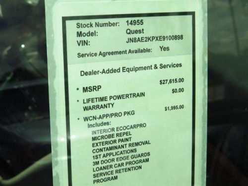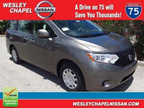 Inspired by super high-speed trains, the 2014 Nissan Quest cuts a bold silhouette that stands out in a crowd. It features distinctive rear wraparound glass, and a dipping side character line that makes it look like it's on the move, even when it's parked. Quest's available one-touch power sliding doors make loading up easy. Quest's interior seating can be configured to your preference. The sliding and reclining second-row captain's chairs fold flat with the pull of a lever, and the quick-release third-row bench seat easily folds flat or can be configured into a 60/40 split. The cargo well behind the rear seats is always open for business, thanks to third-row seats that fold forward. The Nissan Intelligent Key lets you tap a button on the door handle or hatch to unlock Quest, while your keys stay in your pocket or purse. Quest's legendary 3.5-liter V6 engine features an advanced valve timing system that optimizes its power and efficiency. The engine is paired with Nissan's Xtronic CVT creating a smooth ride with no shift-shock. Using hydro-electric power steering instead of hydraulic power steering cuts down on the amount of power needed from the engine. And that means more miles out of every tank. Front and rear vented disc brakes rapidly dissipate heat, giving you fade-resistant, sure-footed stopping power. The Nissan Advanced Air Bag System includes dual-stage supplemental front air bags with seat belt sensors and an occupant-classification sensor. Also, roof-mounted curtain supplemental air bags help protect you in the event of a side impact or rollover. The Pathfinder LATCH system lets you secure LATCH-compatible child restraints in the second row without having to use seat belts or a locking clip. Wesley Chapel Nissan offers a great selection of cars, trucks, and sport utilities. Our Internet Pricing policy offers low prices, plus we offer a wide variety of financing terms. Call our Internet Sales Team @ 866-913-9478 day or night ! Print this page out and present to a Internet Sales Team member and get a extra $250.00 off!