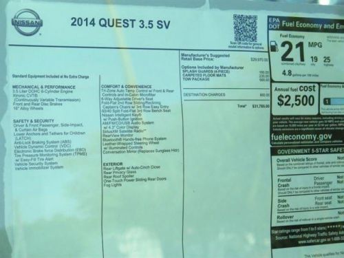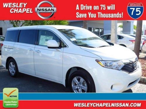 Inspired by super high-speed trains, the 2014 Nissan Quest cuts a bold silhouette that stands out in a crowd. It features distinctive rear wraparound glass, and a dipping side character line that makes it look like it's on the move, even when it's parked. Quest's available one-touch power sliding doors make loading up easy. Quest's interior seating can be configured to your preference. The sliding and reclining second-row captain's chairs fold flat with the pull of a lever, and the quick-release third-row bench seat easily folds flat or can be configured into a 60/40 split. The cargo well behind the rear seats is always open for business, thanks to third-row seats that fold forward. The Nissan Intelligent Key lets you tap a button on the door handle or hatch to unlock Quest, while your keys stay in your pocket or purse. Quest's legendary 3.5-liter V6 engine features an advanced valve timing system that optimizes its power and efficiency. The engine is paired with Nissan's Xtronic CVT creating a smooth ride with no shift-shock. Using hydro-electric power steering instead of hydraulic power steering cuts down on the amount of power needed from the engine. And that means more miles out of every tank. Front and rear vented disc brakes rapidly dissipate heat, giving you fade-resistant, sure-footed stopping power. The Nissan Advanced Air Bag System includes dual-stage supplemental front air bags with seat belt sensors and an occupant-classification sensor. Also, roof-mounted curtain supplemental air bags help protect you in the event of a side impact or rollover. The Pathfinder LATCH system lets you secure LATCH-compatible child restraints in the second row without having to use seat belts or a locking clip. Wesley Chapel Nissan offers a great selection of cars, trucks, and sport utilities. Our Internet Pricing policy offers low prices, plus we offer a wide variety of financing terms. Call our Internet Sales Team @ 866-913-9478 day or night ! Print this page out and present to a Internet Sales Team member and get a extra $250.00 off!