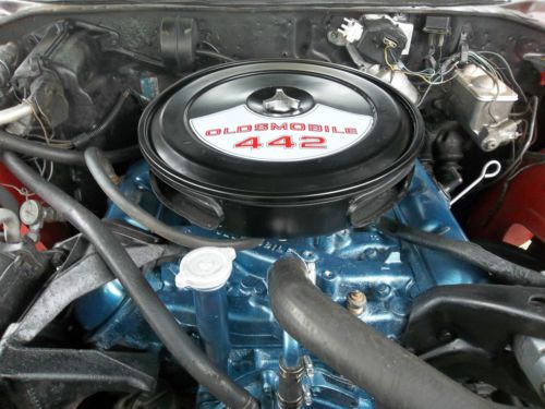 Opportunities like this don't come around very often. Why drive around in a 442 with a column shift, automatic floor shifter, or even the cool dual gate shifter when you can have a factory 4-speed 442?? Remember, the first four in 442 stands for 4-speed!!! This is an extremely rare 1970 Oldsmobile 442 with the real deal 4-speed. Every true Olds guy knows that 1970 is the most highly sought after of all the years in the 442 line. The majority of those same guys will tend to agree that 1970 is the most expensive year to own in the pinnacle of the muscle car era. Any 1970 with a factory 4-speed is also the year that usually brings in the most dollars when a muscle car is restored to high end standards when it rolls over a live auction block. This 442 was originally ordered with a 4-speed and factory air conditioning in the beautiful Twilight blue as shown by the paint code 28 on the data plate. According to the previous owner this genuine 442 is a true W-30 that does have the original 12-bolt positive traction 442 rear end with the original boxed control arms, and the original rear sway bar. There is no way to prove this real 442 4-speed with air conditioning to be a true W-30 unless there is documentation. I looked for the build sheet under the carpet, and inside the front bucket seats. No luck in either spot, however I never looked under the gas tank. I am leaving that treasure hunt up to the new owner. I've only owned this car for less than a month, and I know if I found the build sheet I would end up keeping this car to bring it up to six figure status. I made this purchase in a massive package deal with parts, and another 1970 W-30. After realizing the overwhelming projects that I have going on I chose to sell this one. The same owners names are on both 1970 344 v.i.n. title's. The other 442 W-30 was purchased brand new with special ordered paint in 1970 by this same couple. They loved the W-30 they bought brand new so much that they bought this paint code 28 Twilight Blue 442 that I am selling. The clean and clear title was issued to them on July 2nd, 1991. The actual mileage stated on the odometer was 77,601 at that time. The current odometer reading is 81,273. I have no way to verify the mileage as original. Nowadays the mileage comes up exempt on a new title when a car is freshly registered that is over 10 to 20 years old depending on the state. This genuine 442 is 44 years old, and is truly a barn find that has been sitting for more than 20 years. There was no reason to fake or clone W-30's back then. I will explain everything I know about this real 442 4-speed car, so the lucky bidder who wins this rare gem can decide exactly what they would like to spend prior to placing their bid. I would estimate this car needing 20-30K invested to bring this 442 up to the high end level that it deserves. This car has had only one re-paint in Viper red. The paint work on this car is inferior in my eyes, and a 10-12 footer at best! The fenders on this car are original 1970 442 fenders, but not the original 1970 442 W-30 fenders that came with this car. I decided to keep those, since they are very rare. I've had many Cutlass and 442's over the years, but have had very few W-30's. Although I do have almost 40 years experience to spot a real one. This car had the original W-30 red fenders wells, but I needed them for another car. The red fender wells that are currently on the car are a pair that I purchased off eBay from a gentleman in New York. He said he took them off his 1968 W-30, so they do have the openings on the flat portion in the front of the wheel wells where the ram-air scoop tubes used to come through on a 1968 W-30 car. From everything I've seen, and have been told about this car, I personally believe this to be a true W-30, but the gold is in the build sheet. This is an original ram-air 442, but the hood is not original to the car. It does have the proper chrome twistdowns, and the receivers that both work and twist great. The engine currently in this car came with the package deal, and was previously in this car, but was sold separate from the car. According to the gentleman I bought these cars and parts from who is a preacher, he said this engine does not match. It is believed to be an Oldsmobile Rocket 455 from the early 70's that ran well. This engine does have the proper 396021 F casting numbers. It was just placed into the engine compartment for this sale. I never attempted to start it up, but I figured having this big block Rocket 455 in the car would be better than selling it as a rolling chassis. I had my mechanic try to hook up as many of the proper brackets and parts that I could find to have it looking nice for this quick 3-day "No Reserve" auction. We are pretty sure all of the air conditioning parts are mounted including the condensor in front of the radiator. There is no transmission, clutch, or exhaust included, so the new owner does have his work cut out for him. There are still several swap meets to attend this season, but mostly every part for these cars are made in very nice aftermarket reproduction. I don't want to sugar coat anything in this auction. This car will need a complete and full restoration where every part and every panel will need attention. If this 442 does get documented as a genuine W-30, I would suggest that this car receives a complete frame-off restoration. I truly believe that it deserves that same treatment simply being a true Twilight Blue 1970 442 4-speed with factory air conditioning. That color combination with black W-30 stripes, and those options is extremely rare. Most of the chrome is present including a rear cut-out back bumper. The front and the rear floor pans are the originals and have never been replaced. There has been some shoddy patch work done, so to do this car right, I believe it should have all new floors. The carpeting is worn, but there is a new set of four black carpeted floor mats. The front bucket seats had some repa