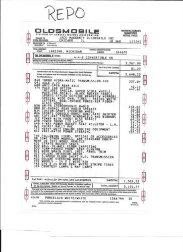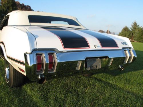 1970 442 pace car, just finished 2 year frame off restoration last November. drive time is less than 2 miles to test car and into and out of enclosed trailer for its first show at the MCACN V muscle car and corvette nationals{this is a premier show with the best cars in the country attending} . where it scored a gold concours award in stock concours judging. attention to detail on this car is second to none. if you look at the pictures and follow the link the car and build will speak for itself. nos and rebuilt stock parts used throughout build. best of material {paint/primer} used on car. engine/trans/rearend rebuilt and number matching to car. sent alternator,carb, distributer, power steering pump, steering box, water pump and starter out to be rebuilt. all new lengendary interior perfect! every nut /bolt/bracket replated to factory specs. all new soft ray tinted glass, everything for the hyd top rebuilt and replaced. firestone wide ovals G70/14. check this link out for a full restoration thread and complete pictures of the build! PLEASE do not ask reserve as this is an auction, if you have less than 10 stars you must call me before bidding or I will cancel bid! I will be happy to answer any questions regarding car. I RESERVE the right to end auction at any time for ANY reason. http://classicoldsmobile.com/forums/major-builds-projects/40088-1970-442-pace-car-restoration.html for the numbers guys. block 396021F... heads 403686E... exh manifolds W/Z 402295/402294...carb 7040257... dist 1111982... altenator1100890... starter 1108386... water pump 404847 X...water pump pulley 405461... crank pulley 405459... On Feb-11-14 at 20:47:43 PST, seller added the following information: to help answer a bunch of the same questions, please do some research on oldsmobile 442s, the first few vin #s tell some of the story of the car 34467 denotes this car as a real 442 convertible. the M in the vin denotes it as a lansing mi built car where all the 1970 442 pace cars were built. I should of posted a picture of the cowl tag but was only allowed so many pics. I will try to rectify this! cowl tag info is as follows, ST70-34467, ASSY PLANT LAN {LANSING}, BODY 409403, TRIM-970A {black bucket interior}, paint 10-A {porcelain white} build date- 4-a, acc code Y-74{pace car option}. the car has stock{rebuilt} am/fm radio, the correct 1 year only two piece radio. also comes with rebuilt stock optional 8 track that plugs right into stock radio harness. also the link I posted goes to classic oldsmobile.com you will have to take a couple of minutes to sign up/register to see all the pics. its free and easy, and if you are serious about this car it will be WELL worth your time! in the pics the car has supreme taillight lenses but were switched with correct nos 442 lenses. front headlights are T-3s. car has stock rally pac gauges that were sent out to be gone thru and calibrated. |