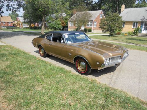 1969 cutlass w31 tribute 350 built to w31 specs harland sharp roller rockers, hooker headers,offy intake,number 5 heads,air cleaner is original ram rod w31 , turbo 350 transmission stage 3 ,12bolt 433 gears w27 cover all new ,new exhaust,window felts,emblems,rear bumper,holley spread bore reworked by the card shop ,every thing works as it should except for the wipers which i have never checked out may be a fuse may need a wiper motor,i raced this car 3 times and it ran a 12.98,13.03,13.11,paint is very nice and shows very well,vinyl top is nice ,no signs of rust bubbles around top,seats headliner dash etc is all original and clean,,nos oldsmobile floor mats,double din with nav mounted under the dashvery clean. polk amp polk 6x9's jl 10' sub ,drivers door panel has small tear @ the bottom ,,new coker red lines with nos oldsmobile poverty caps ,or new cragars come with car the cheater slicks in the pictures are sold ,15x10, 275 60 15 pro tracs and 5x4,165 15 pro tracs on new cragar s/s rims less then 500 miles , BEFORE BIDDING COME AND LOOK AND DRIVE WEATHER PERMITTING, NEVER ANY RUST ISSUES, ALL ORIGINAL PANELS NO UNDERCOAT COVER UP HERE, I ALSO HAVE A COMPLETE 355 10 BOLT ALL NEW IF BUYER DOESNT WANT THE 433'S ,the spots in the trunk is clear coat that turned yellow ish,pictures of undercarriage was taken before new 2.5 exhaust and magnaflow mufflers,